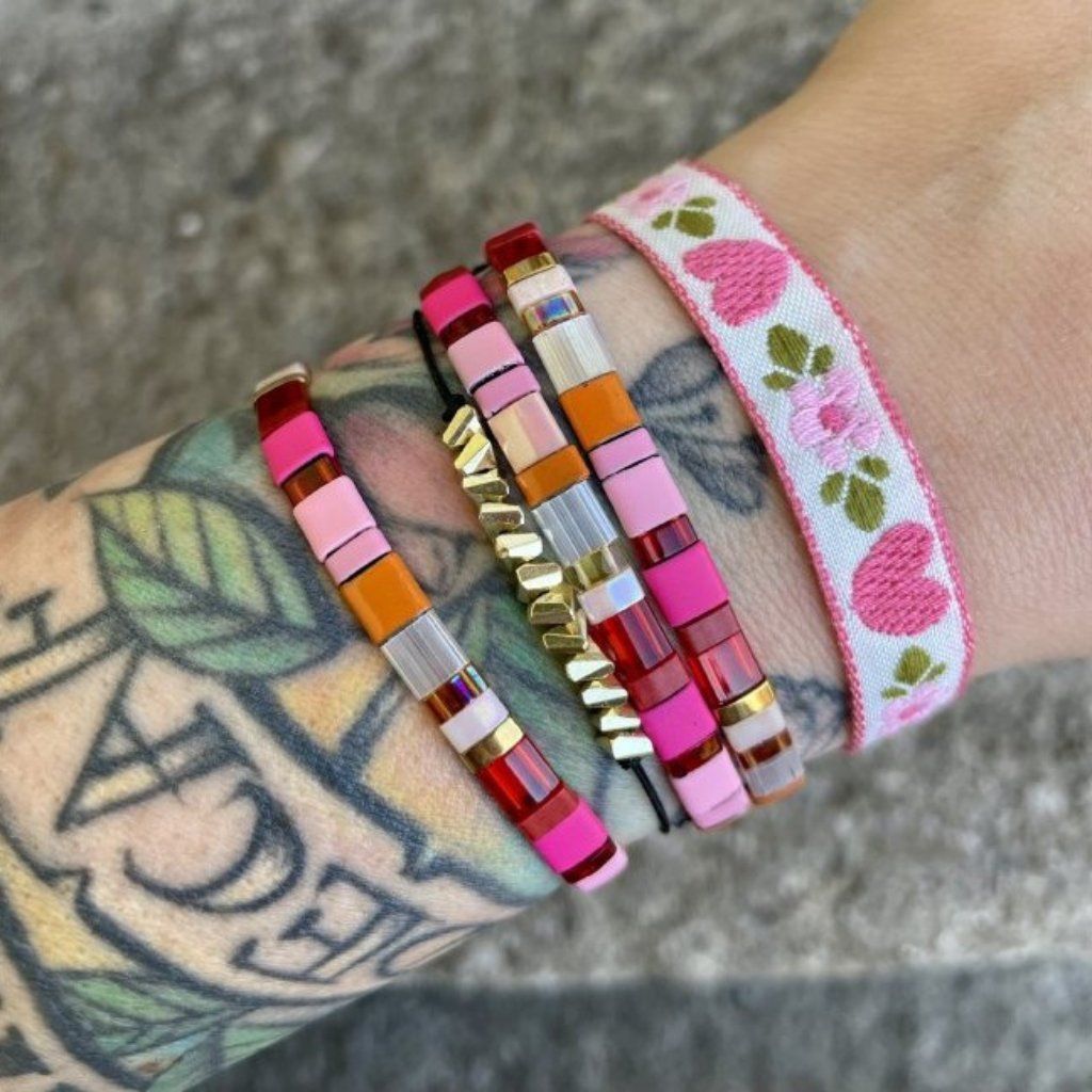 Miyuki Tila korálky, textilní stuha a zlaté trojúhelníčky! To je kombinace, která má sílu rozjasnit i ten nejdepresivnější den! Neboj se barev a ukaž, jak umíš ladit svůj outfit.