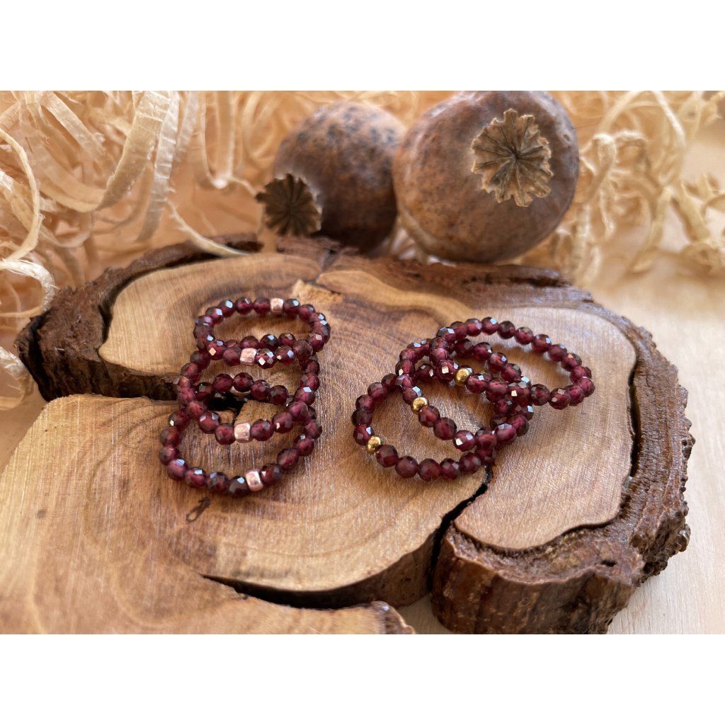 Tento prstýnek je tvořen z drobných minerálních korálků z granátu, které jsou pečlivě vybírané a broušené – tzv. fasetované. Díky tomu získává výrazný třpyt a hluboký barevný efekt.