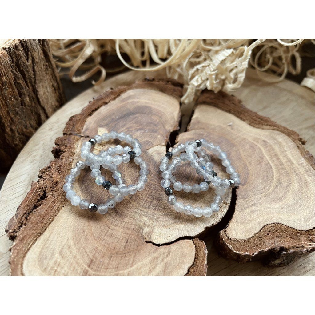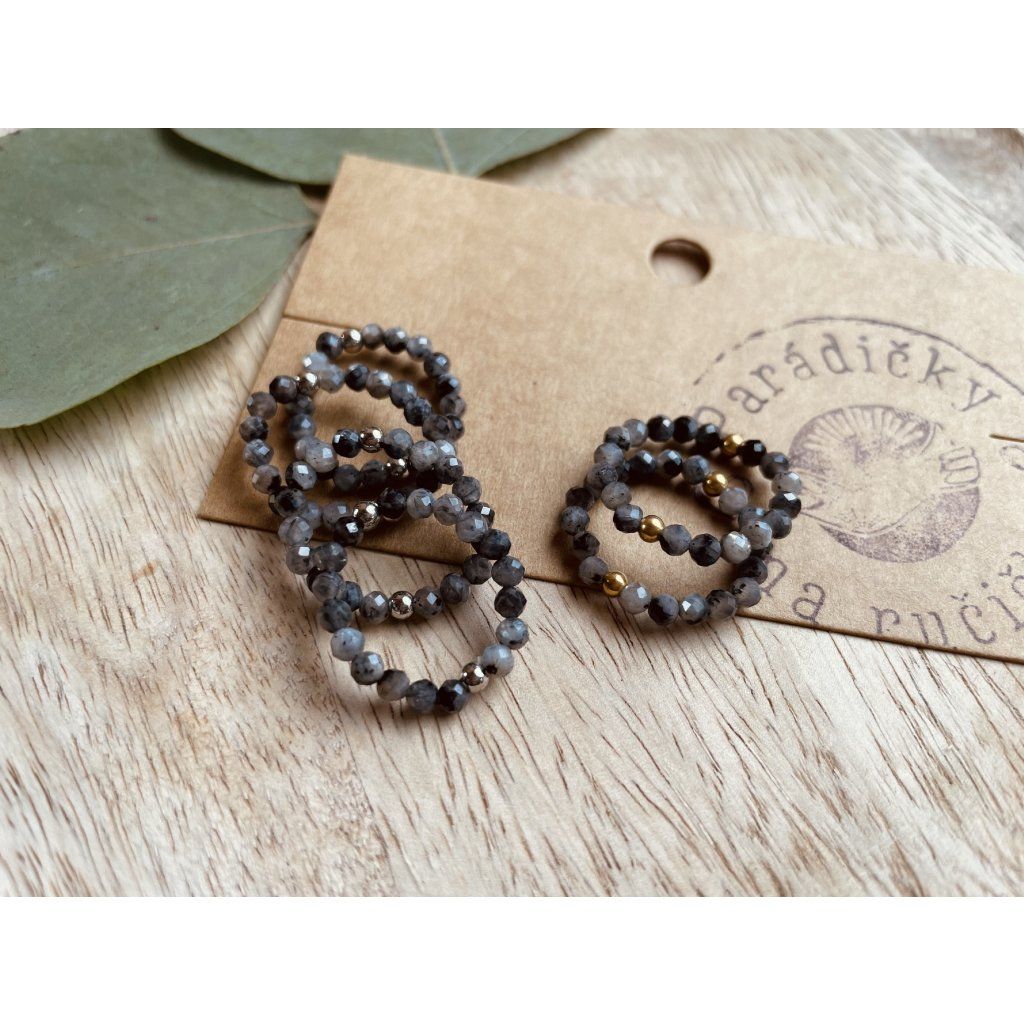 Tento prstýnek je tvořen z drobných minerálních korálků z labradoritu, které jsou pečlivě vybírané a broušené – tzv. fasetované. Díky tomu vyniknou jeho typické odlesky a hra světla při každém pohybu ruky.