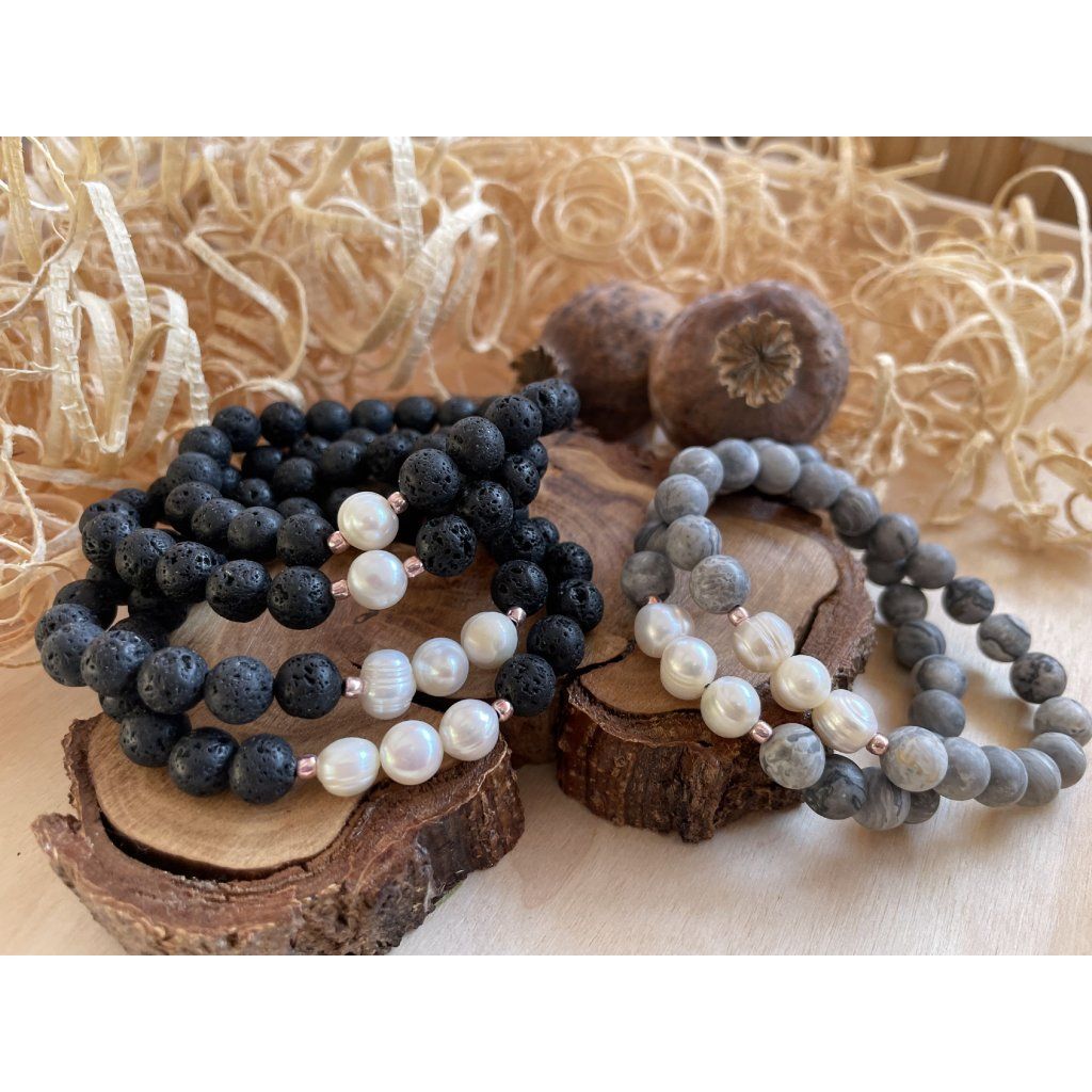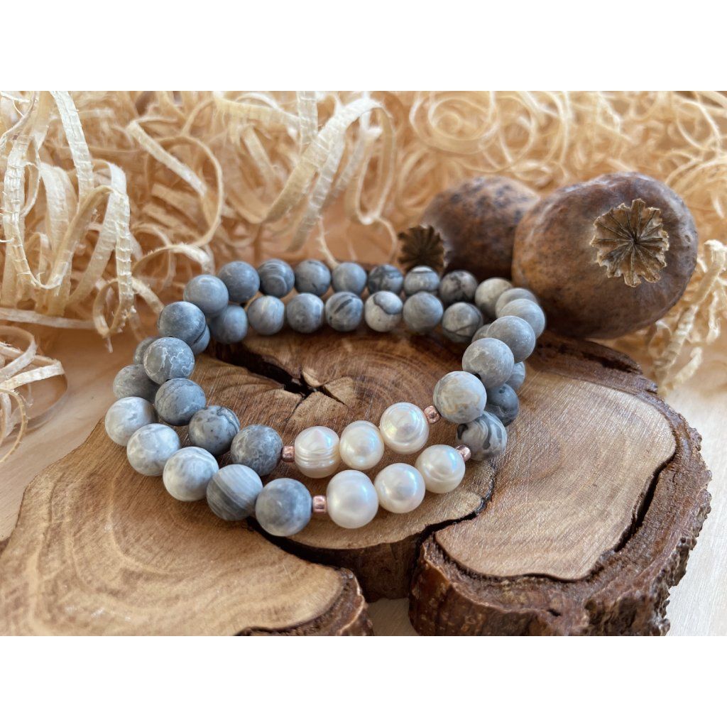 Minerály přinášejí přírodní strukturu a jedinečný charakter, zatímco říční perly dodávají jemnost, lehký lesk a pocit elegance. Společně vytváří šperk, který se snadno kombinuje a nikdy nevyjde z módy.